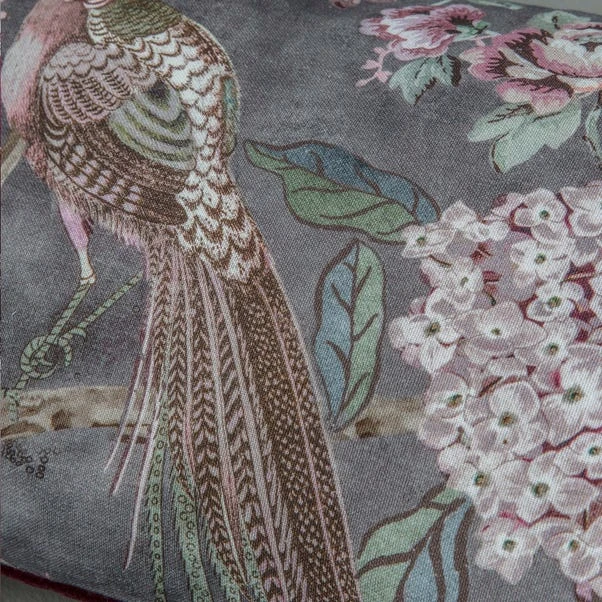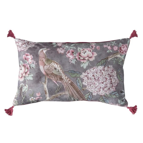 Add this impressive cushion to your home for a strikingly elegant piece of décor to uplift your space. With a digitally printed scene of florals and a partridge on cotton velvet and miniature berry-coloured tassels in each corner, this cushion provides effortless sophistication, style and comfort. The plain coordinating velvet reverse balances the busy front design and a feather filling creates the perfect plump support.