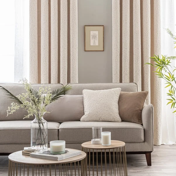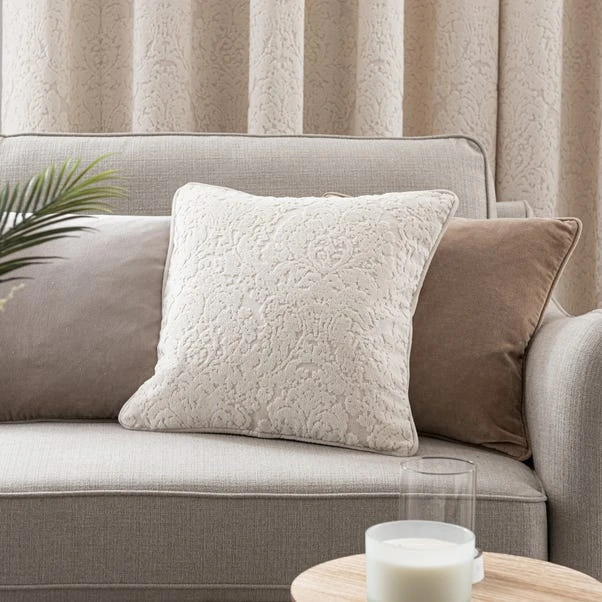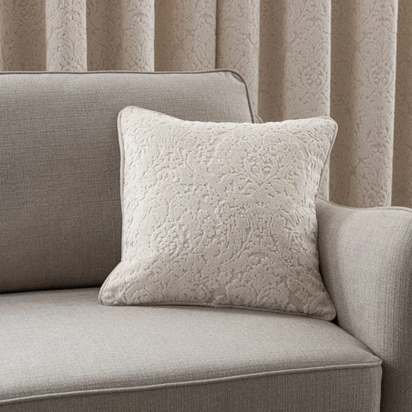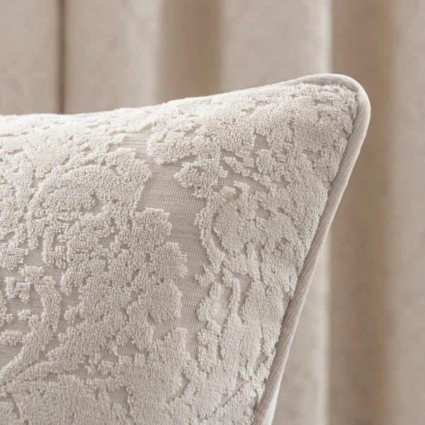 Filled with a comfortable feather inner, this stunning cushion with a cut velvet design inspired by traditional damask patterns will add a touch of elegance with its understated ivory colourway. Matching curtains available in range of sizes to create a coordinated look.