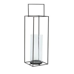 Create a gorgeous display of light and shadows with this gorgeous London lantern. This modern piece features a black metal frame with a glass candle holder and metal handle that is securely attached for easy transportation around your home. Complete this lantern with a LED candle pillar, perfect for creating a warm yellow flickering glow in your room.