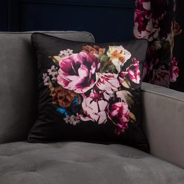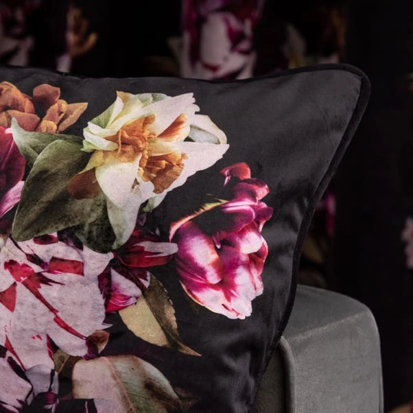 For maximum impact dress your room with this luxurious velour cushion featuring a colourful print of realistic looking large florals. This cushion comes complete with an inner feather filled for your comfort. Matching curtains are available in a range of sizes to create a coordinated look.