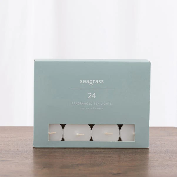 This pack of 24 seagrass fragranced tealights have a burn time of up to 3 and a half hours, perfect for filling your home with sparkling citrus notes, adding lift to a refreshing oceanic heart infused with soft sandalwood and vanilla on the base.