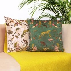 Featuring a busy print of monkeys swinging from vines, exotic birds, and cheetahs in tropical foliage. This exciting velvet square cushion will bring energy to your space whilst adding comfort with the soft velour textures. Machine washable properties ensure easy clean and have a zip closure.
