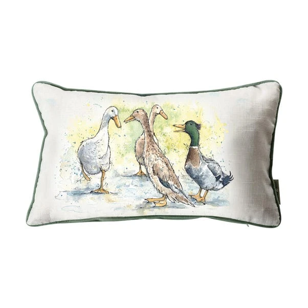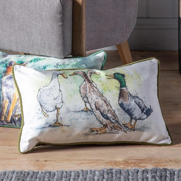 Bringing an animated scene to your living space, this rectangular cushion features a group of ducks quacking amongst each other. A plain velvet piping and reverse fabric is used in a complementary colour to finish the cushion.