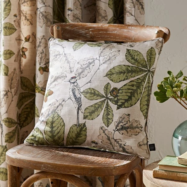 Featuring a woodland inspired design, the Arboretum cushion hosts a beautifully detailed design that sees a siskin, nuthatch and lesser spotted woodpecker sat amongst leaves, branches, and acorns. Printed on a natural backdrop, the Arboretum cushion will bring a touch of nature to your home interior. The cushion has been filled with a plump recycled polyester filling. Coordinating Arboretum Natural curtains are available to complement this cushion.