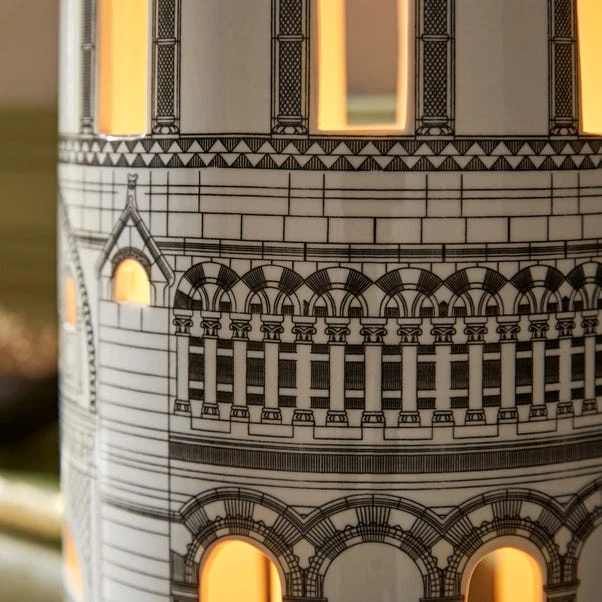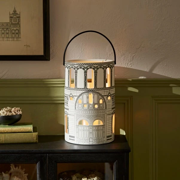 The Cathedral to Nature Lantern is perfect for adding ambience and interest to any room in your home. Beautifully crafted from ceramic with a glazed finish. This lantern features a cut out window design that casts a lovely light when the candle is lit. Complete with a metal carry handle for easy hanging or displaying on a table top. This small lantern can also be paired with the small Cathedral to Nature Lantern to create a beautiful light display.