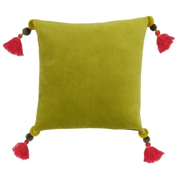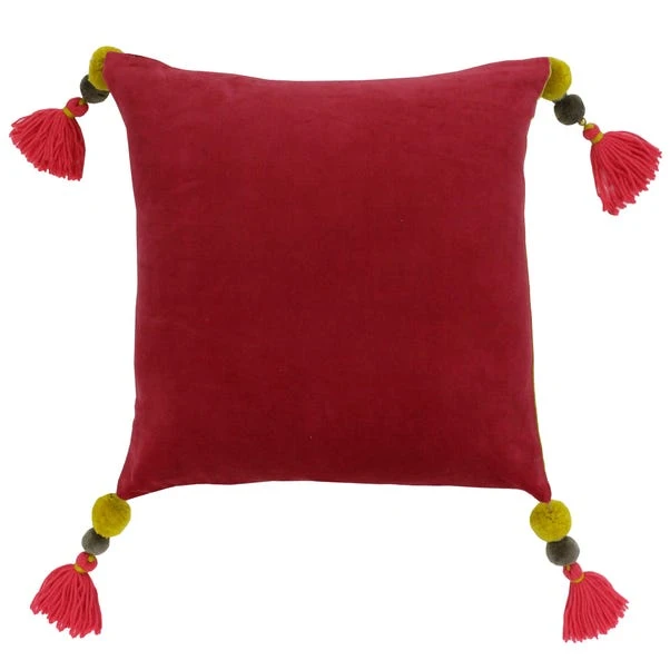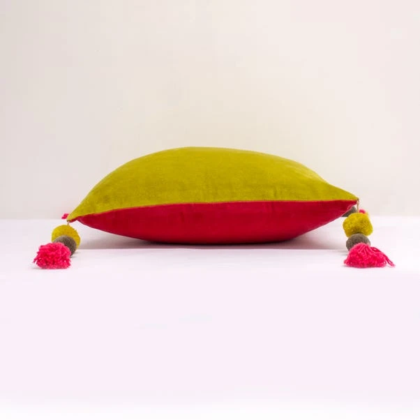 Crafted from a luxurious 100% cotton faux velvet fabric, this reversible cushion is styled in a two-tone pomegranate pink and lemon colourway for added vibrancy and versatility. The removable cover is machine washable for convenient care and features four high-quality tassels for a sophisticated finish. Filled with plump and durable polyester for improved fullness, this cushion is ideal for adding colour and comfort to your home.
