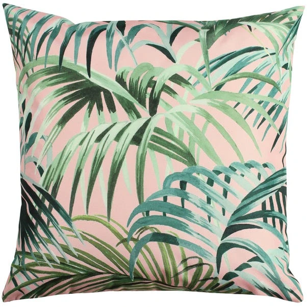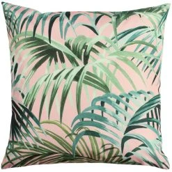 Featuring a jungle inspired scenic landscape in a beautiful pink blush and forest green colour palette, this cushion is made of water resistant polyester, this outdoor cushion is designed to withstand showers and spills. Complete with a coordinating palm leaf reverse and hidden zip closure, it has also been designed, printed and made in the UK.