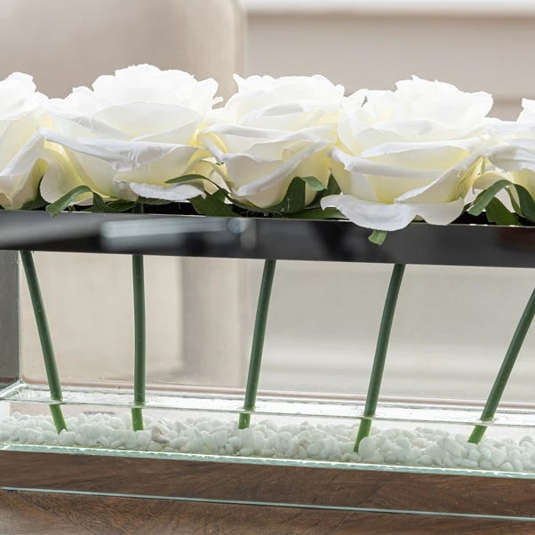 Elegantly designed, these stunning white roses is beautifully presented in a mirrored edge vase with white pebbles. Stylishly crafted in a clear vase, these artificial flowers features a realistic finish.